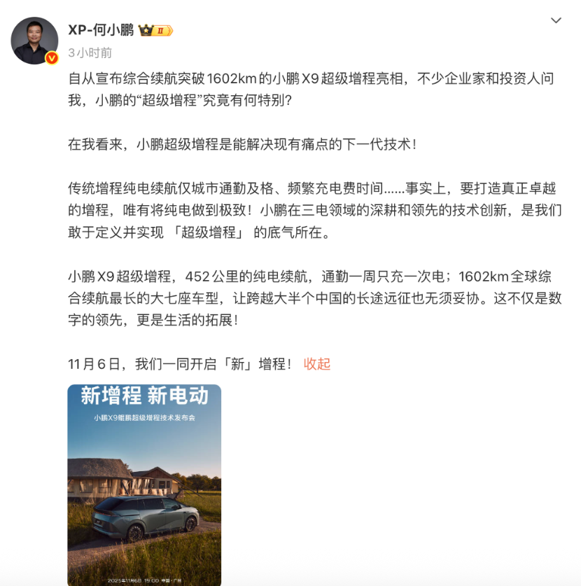 在他看来,“小鹏超级增程是能解决现有痛点的下一代技术”。