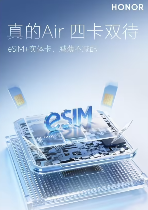 荣耀终端股份有限公司旗舰手机产品经理李坤发文,对即将发布的 Magic8 Pro Air 进行了预热,新机确认支持 eSIM,搭配实体 SIM 卡可实现四卡双待。