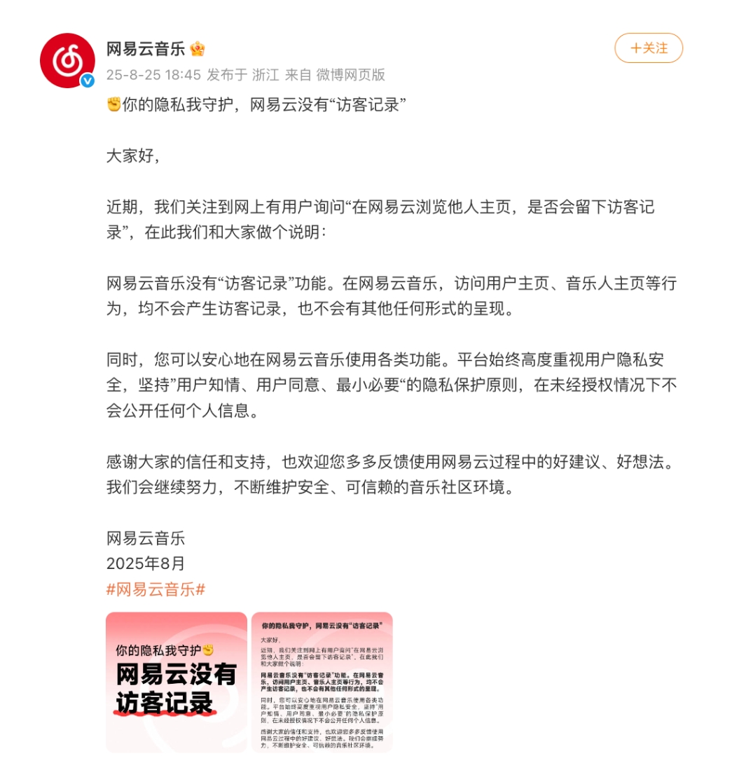 日前,@网易云音乐 发文称,网易云音乐没有“访客记录”功能。在网易云音乐,访问用户主页、音乐人主页等行为,均不会产生访客记录,也不会有其他任何形式的呈现。平台始终高度重视用户隐私安全,坚持”用户知情、用户同意、最小必要“的隐私保护原则,在未经授权情况下不会公开任何个人信息。