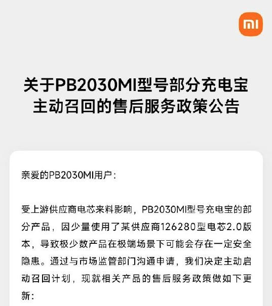 小米8月29日发布公告称,受上游供应商电芯来料影响,PB2030MI型号充电宝的部分产品,因少量使用了某供应商126280型电芯2.0版本,导致极少数产品在极端场景下可能会存在一定安全隐患。通过与市场监管部门沟通申请,小米决定主动启动召回计划。