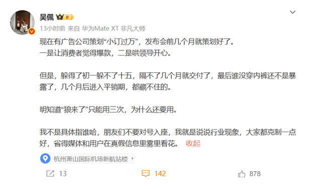 知名汽车博主“吴佩”日前爆料称,现在有广告公司策划“小订过万”,发布会前几个月就策划好了。