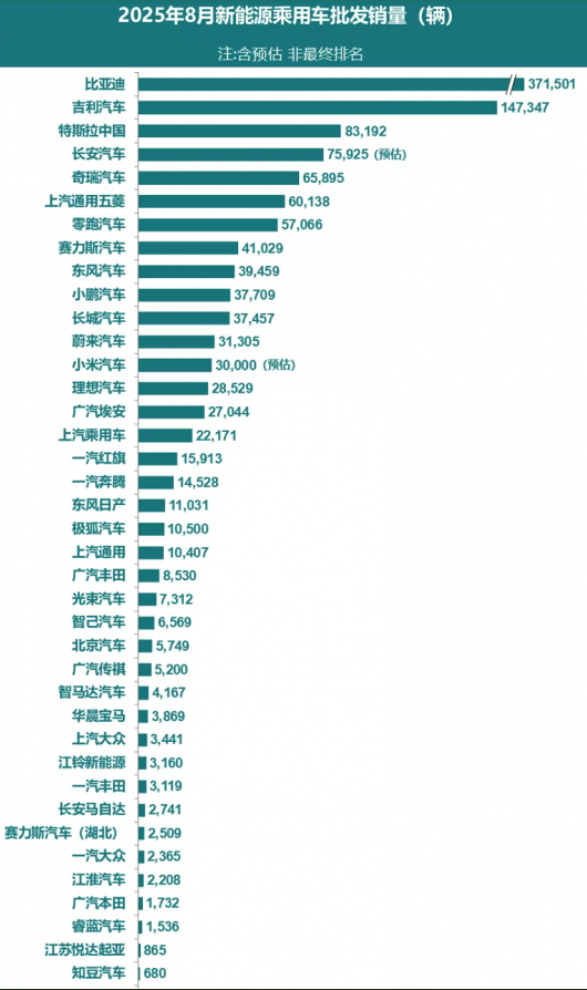 根据乘联分会数据,全国乘用车市场2025年7月新能源批发销量万辆以上厂商的销量之和,占总体新能源乘用车当月销量的91.7%。根据月初汇总数据,这些7月新能源批发销量万辆以上厂商的8月销量为119万辆。虽然由于休高温假的企业较多,但目前绝大部分厂商销量基本都已经锁定,因此按照上月结构占比结合本月数据,测算8月的全国新能源乘用车批发销量为130万辆。