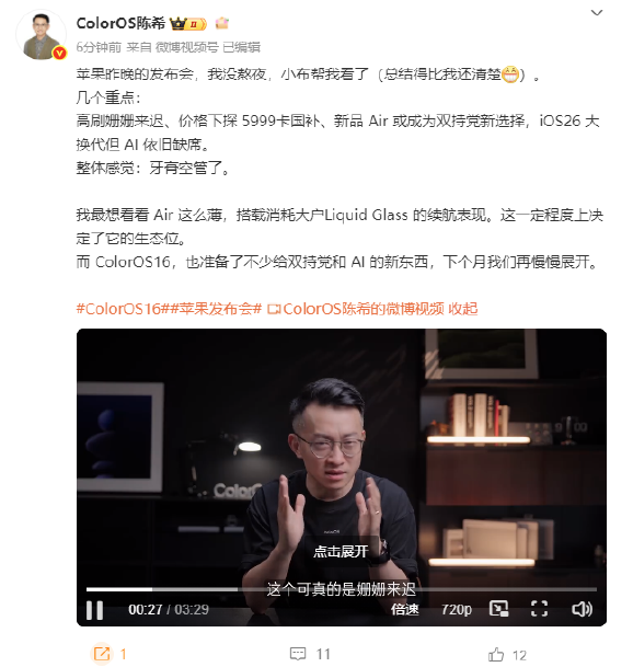 9月10日消息,OPPO ColorOS 设计总监@ColorOS陈希 发微博分享了对苹果发布会的看法。