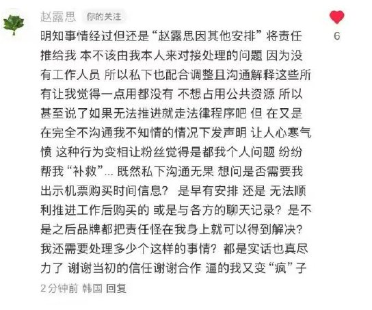 对此,演员赵露思在社交平台回复斐乐表示:明知事情经过,但还是‘赵露思因其他安排’将责任推给我。本不该由我本人来对接处理的问题,因为没有工作人员,所以私下也配合调整且沟通解释,这些所有让我觉得一点用都没有,“谢谢当初的信任谢谢合作,逼的我又变‘疯’子。”