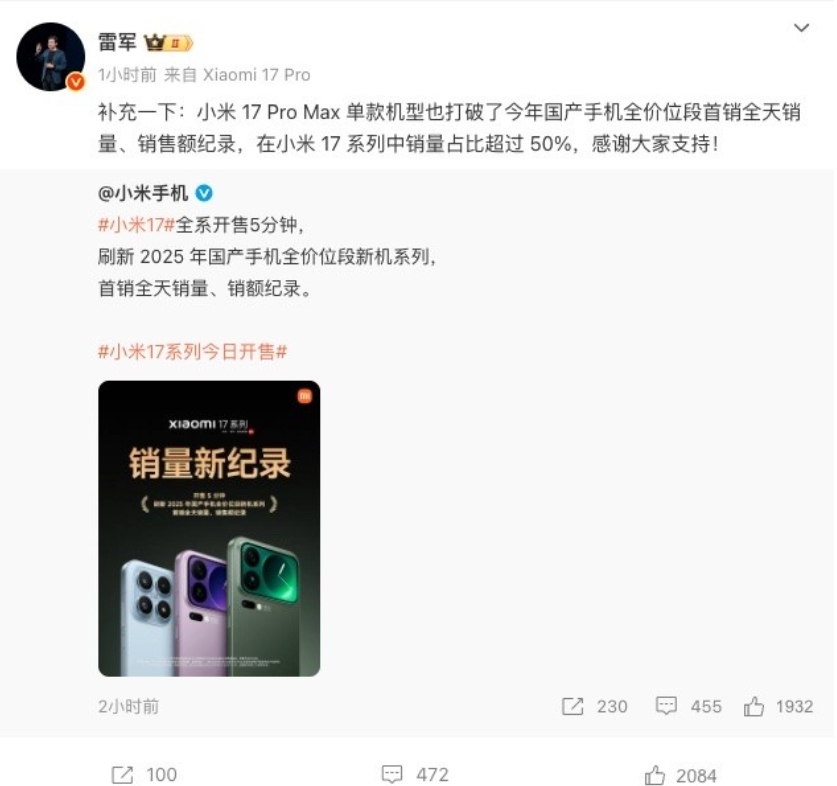 同时,小米CEO雷军发文补充,小米 17 Pro Max 单款机型也打破了今年国产手机全价位段首销全天销量、销售额纪录,在小米 17 系列中销量占比超过 50%,感谢大家支持!