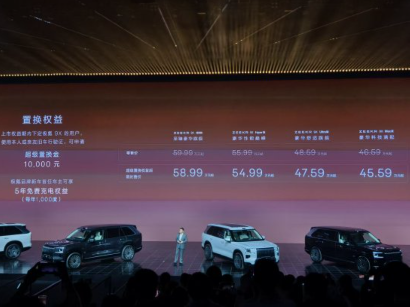 9月29日晚间消息,极氪9X今日正式上市,定位豪华旗舰SUV,共推出Max版、Ultra版、Hyper版、曜黑版四个版型,官方零售价46.59万元起,超级置换权益后限时售价分别为45.59万元起,将于9月30日正式交付。