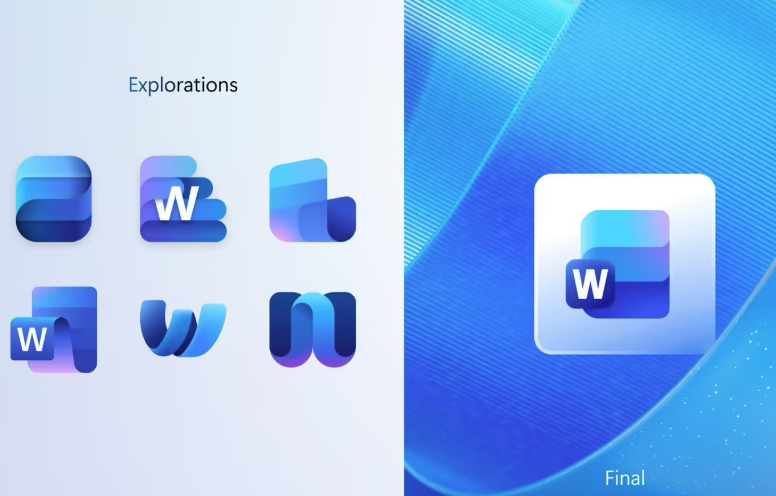 Word 的概念图标包括类似笔记本的设计,以及不同方式呈现文档或纸张堆的样式。微软曾尝试将 Word 字母作为图标主要元素,也尝试过字母融入图标或完全省略字母。最终微软选用了三条水平条的设计,并提供带字母和不带字母两种版本。